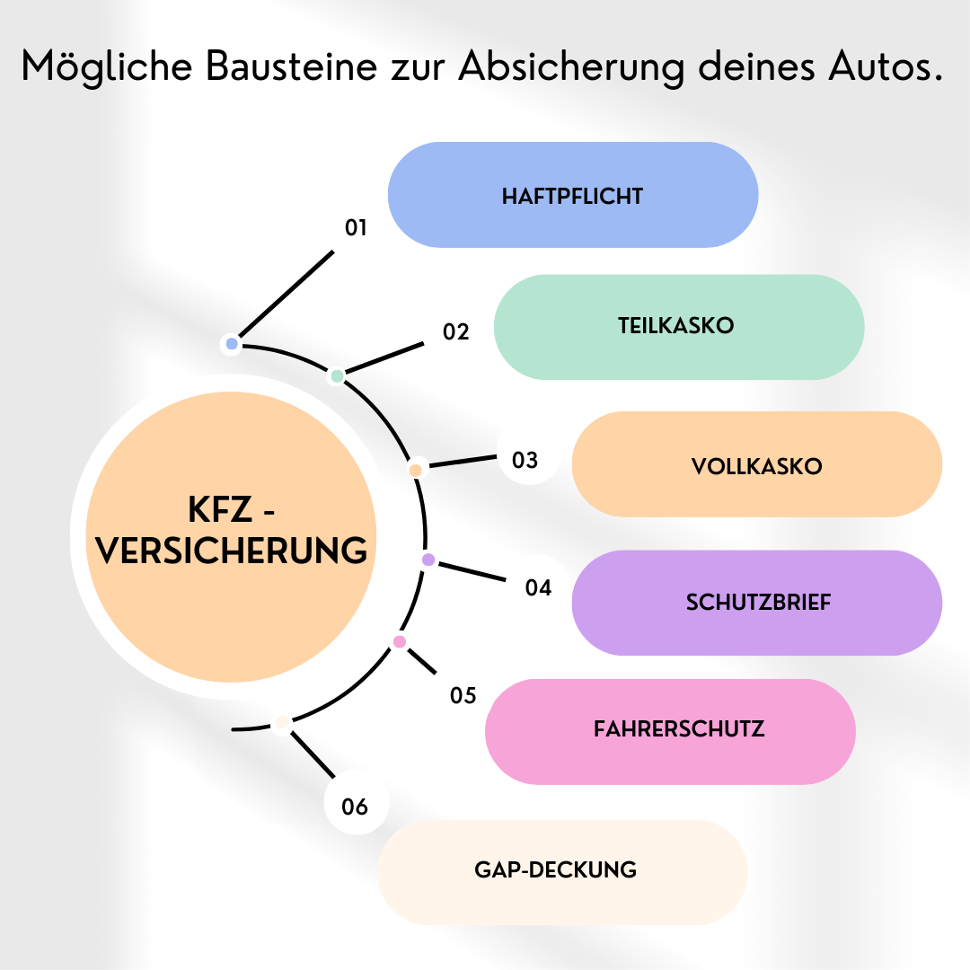Ergänzt wird die Haftpflichtversicherung je nach Wunsch mit verschiedenen Bausteinen wie z.B. die Teil / oder Vollkaskodeckung, die auch Schäden am eigenen Fahrzeug abdecken können, ein Schutzbrief für den Fall einer Panne oder einen Schutz für den Fahrer.
